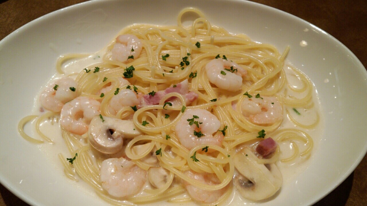 晩ご飯は、エビとマッシュルームのクリームなんちゃらパスタ。