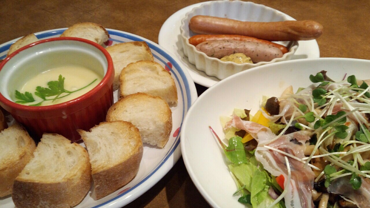 晩ご飯は、温サラダ、ソーセージ、チーズフォンデュ、和風パスタ、パンナコッタ。