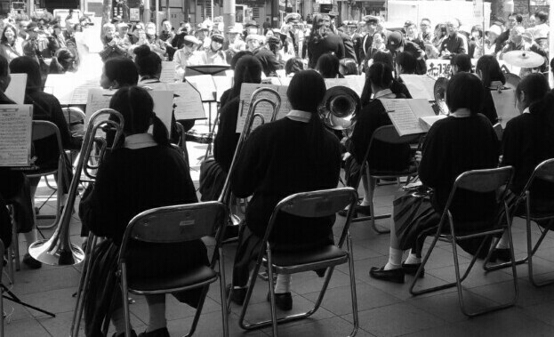 駅前で女子高生のブラスバンド部とピーポくん。
