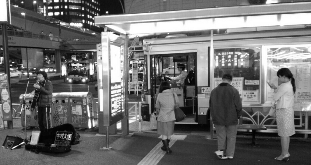 バス停と歌う若者