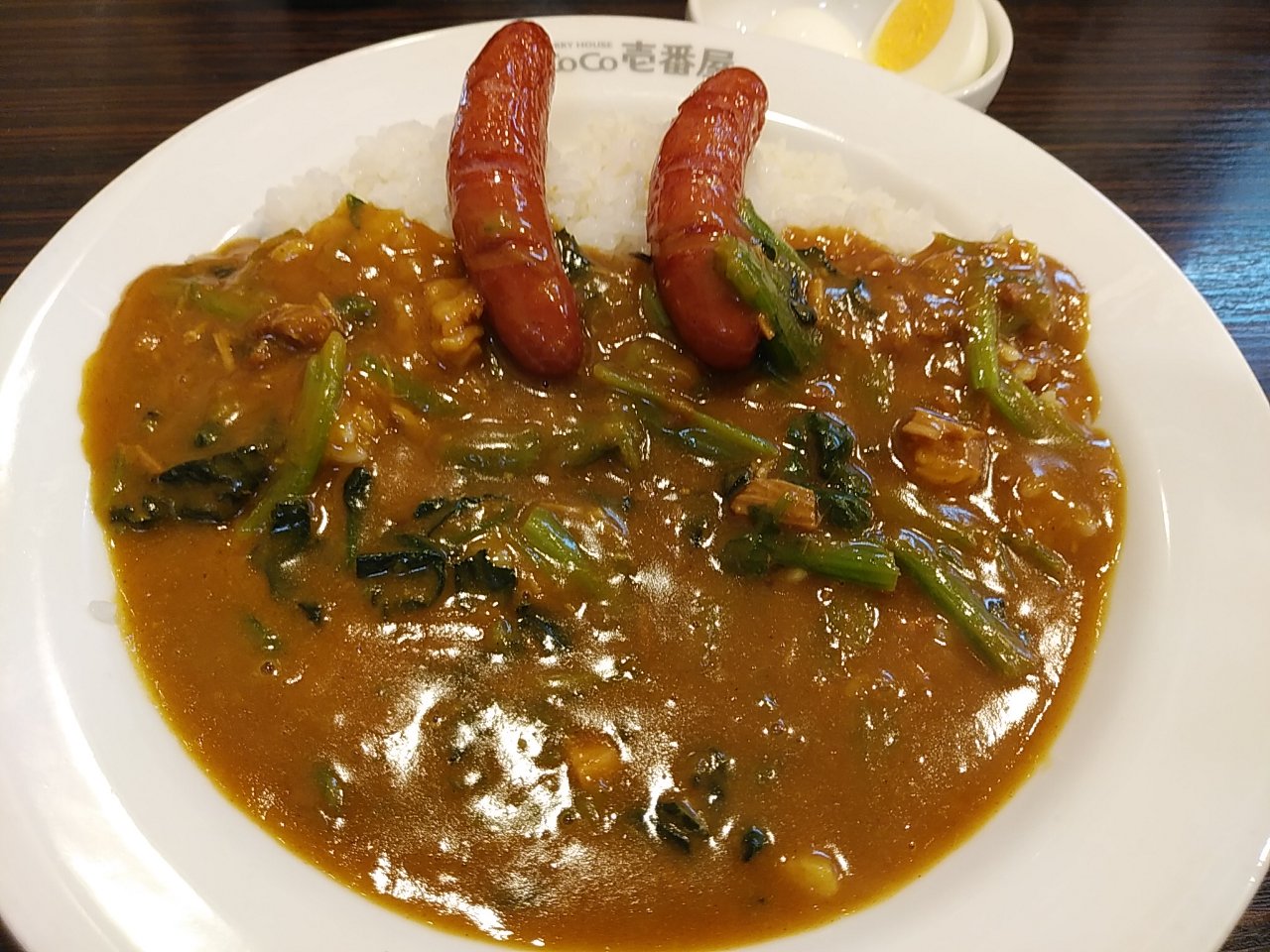 ポークカレー。甘口。追加ソース。ソーセージ2本。ハーフほうれん草。ゆでタマゴ。オレンジジュース(ネコイチラバーストラップ)。