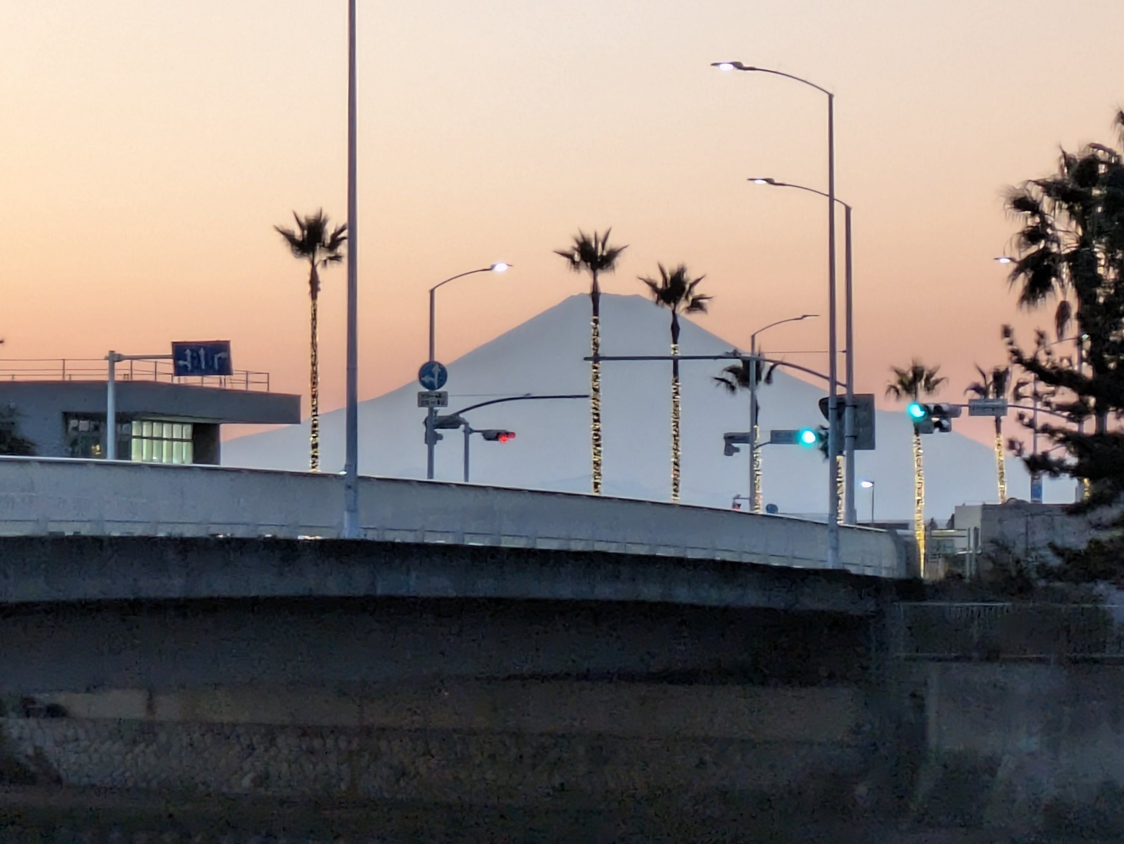 江の島近くから見た夕暮れの椰子の木と富士山。