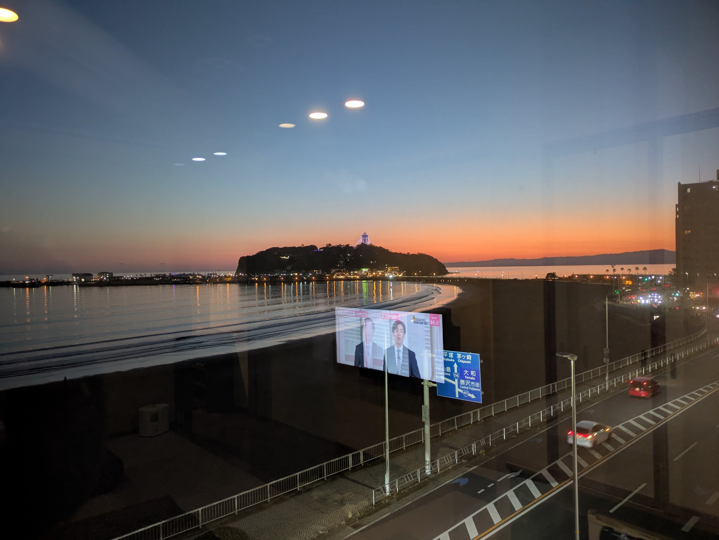 写り込みが激しい夕暮れの江の島。