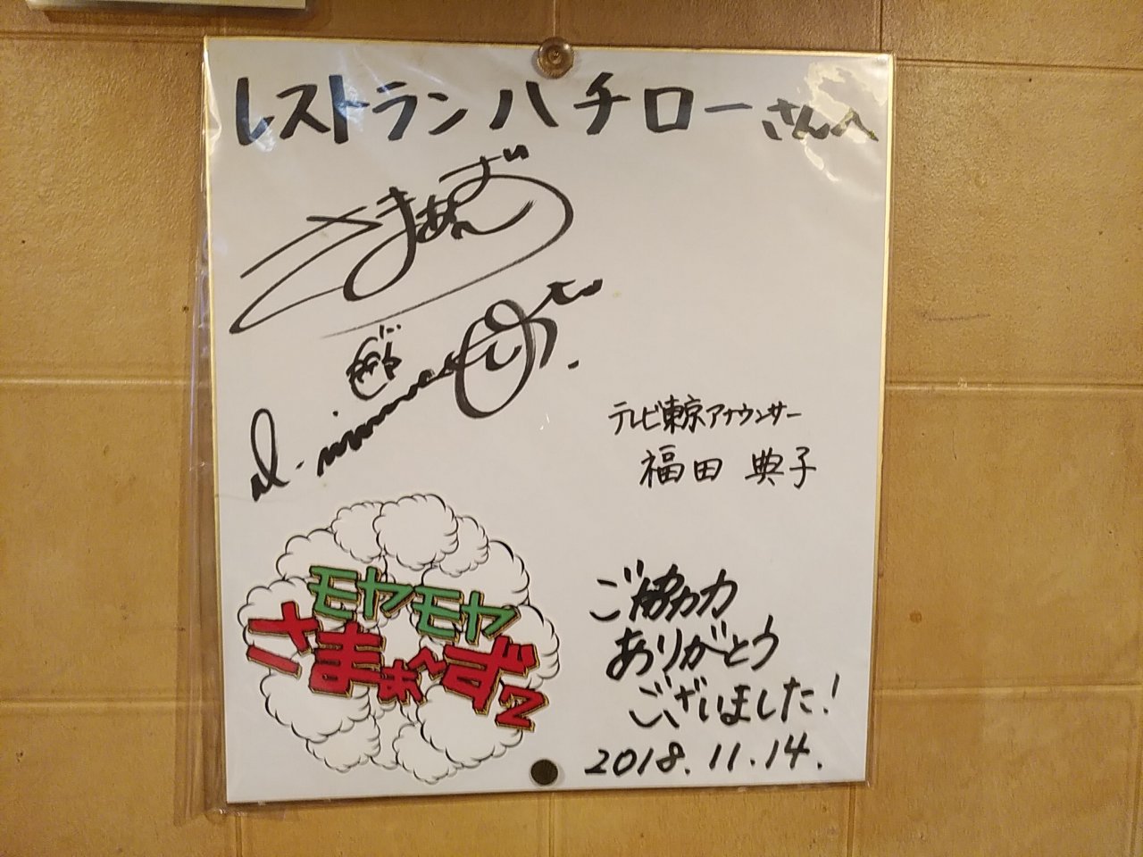 『モヤさま』のサインがあった。