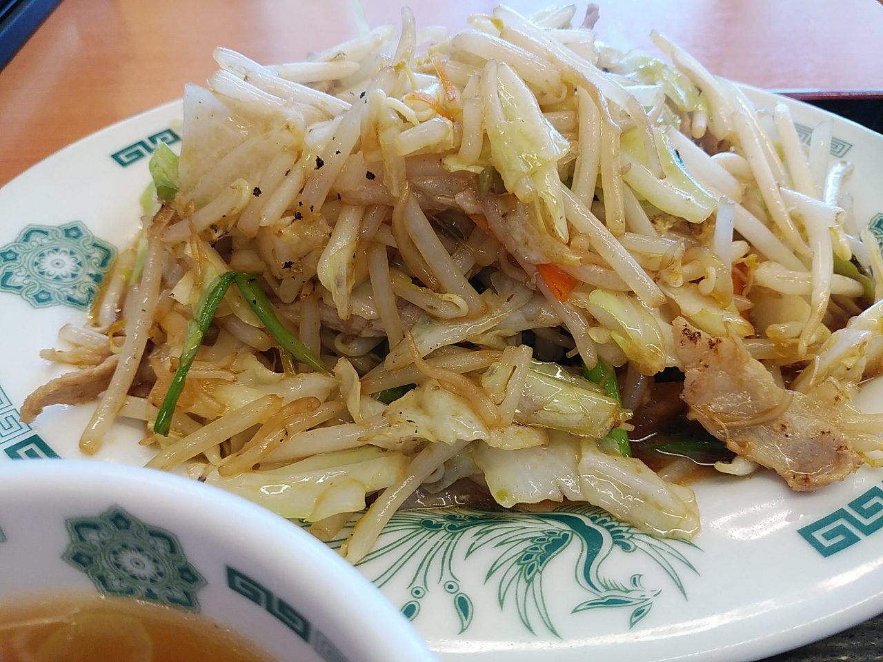 今朝はお腹が空き過ぎて帰りに日高屋で、肉野菜炒め定食。