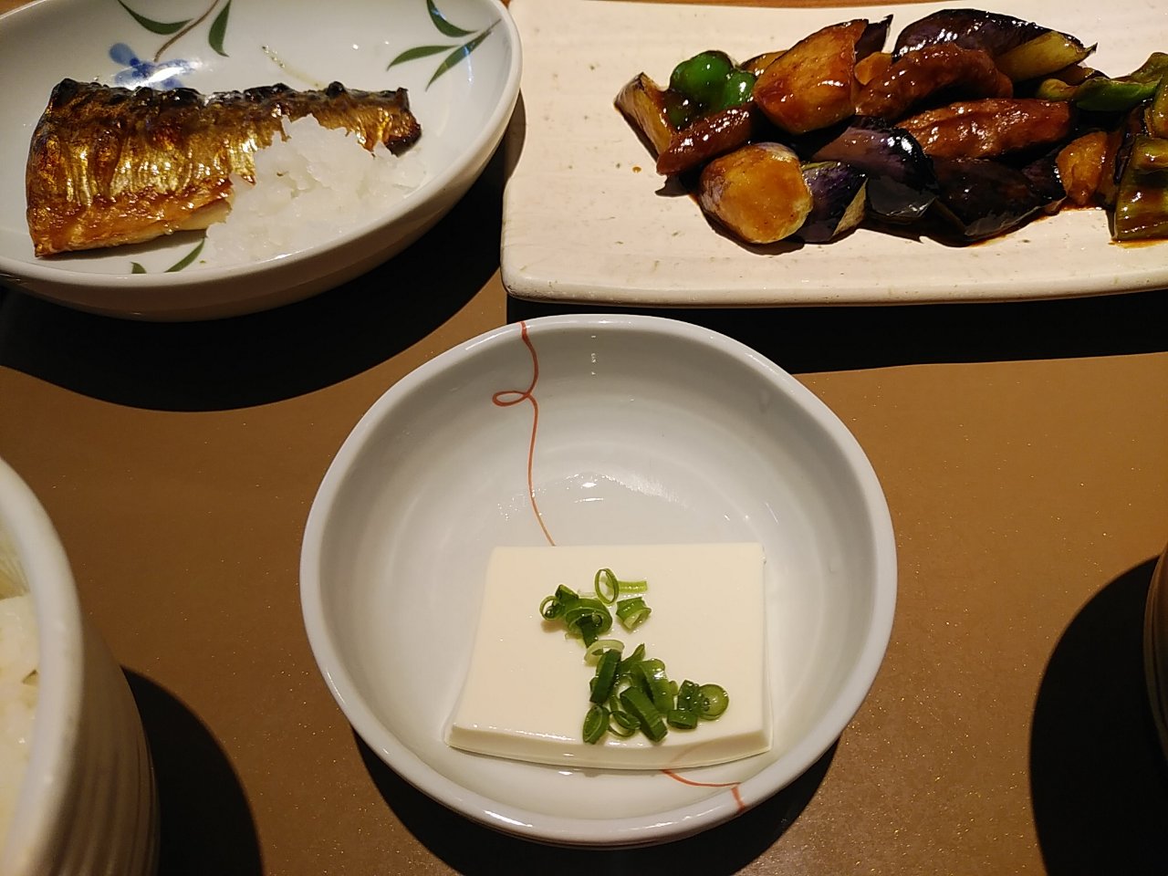 昨日の朝ご飯は、大豆ミートのなす味噌と焼魚の定食。