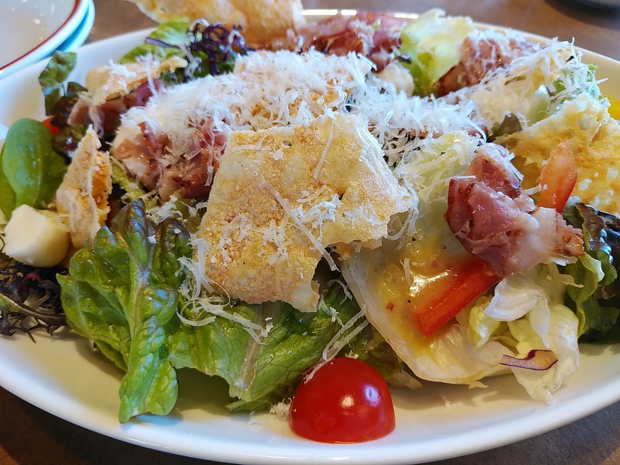 お昼ご飯は、ジェノベーゼのピザ、なんちゃらサラダ、ほうれん草とベーコンの和風パスタ。